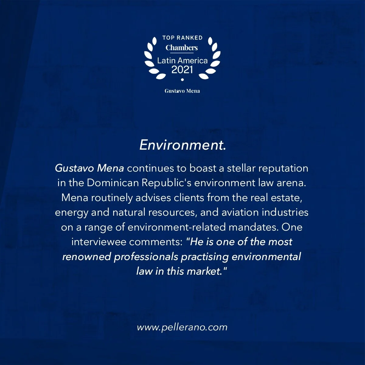 Según Chambers: Gustavo Mena continúa contando con una reputación estelar en el campo del derecho ambiental de la República Dominicana. Mena asesora habitualmente a clientes de las industrias de bienes raíces, energía y recursos naturales y aviación en una variedad de mandatos relacionados con el medio ambiente. Un entrevistado comenta: "Es uno de los profesionales más reconocidos en la práctica del derecho ambiental en este mercado".