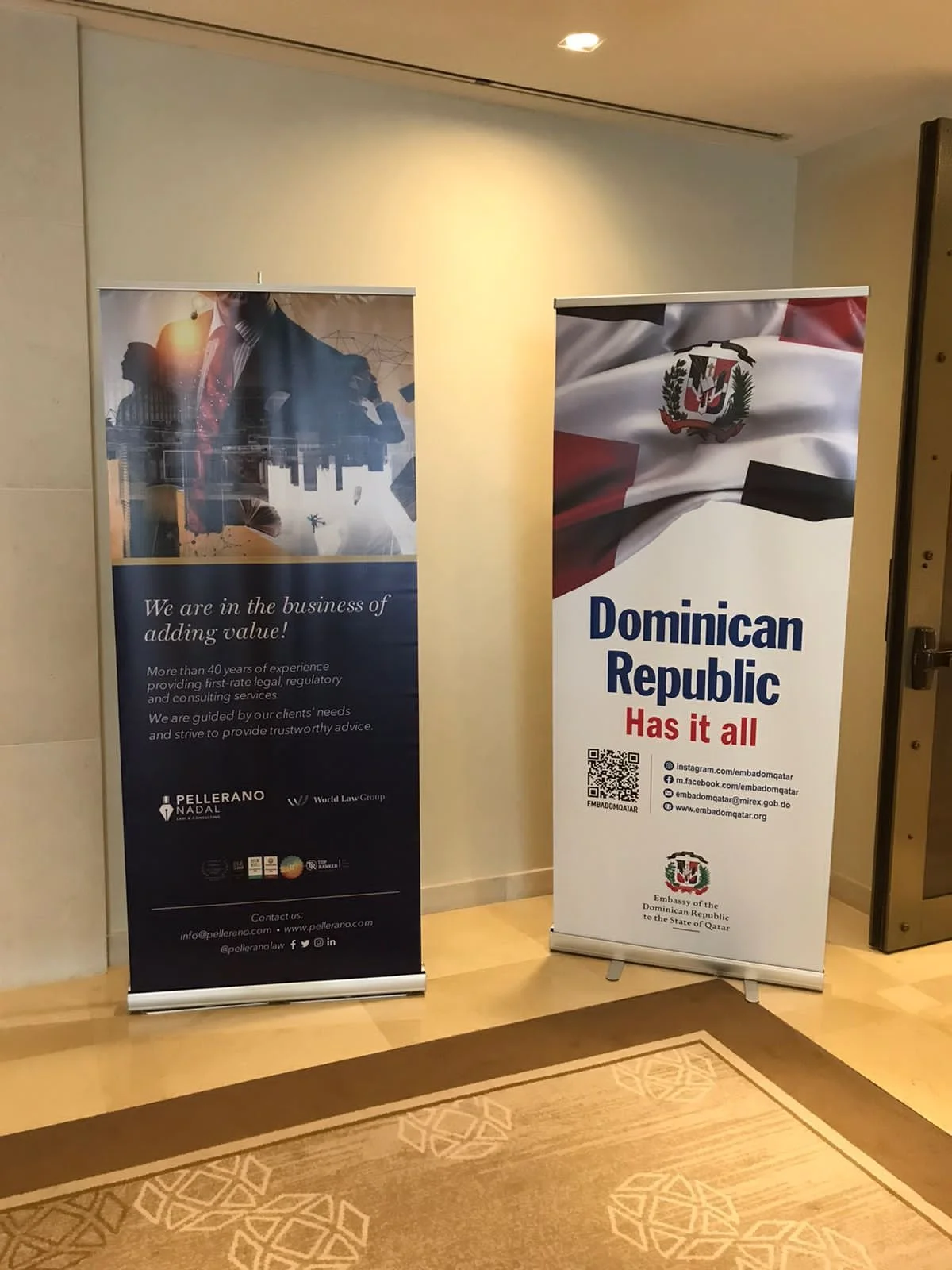 Luis Rafael Pellerano y Ricardo Pellerano Nadal estuvieron participando en diferentes eventos y encuentros privados organizados por el Honorable Embajador de la República Dominicana en Qatar, Georges Bahsa Hazim y, por Carlos Espaillat, Subjefe de Misión de dicha Embajada. En estas reuniones privadas de alto nivel, se conversó sobre el interés de dinamizar la inversión en varias industrias de nuestro país, principalmente a través de los proyectos de alianzas público privadas.